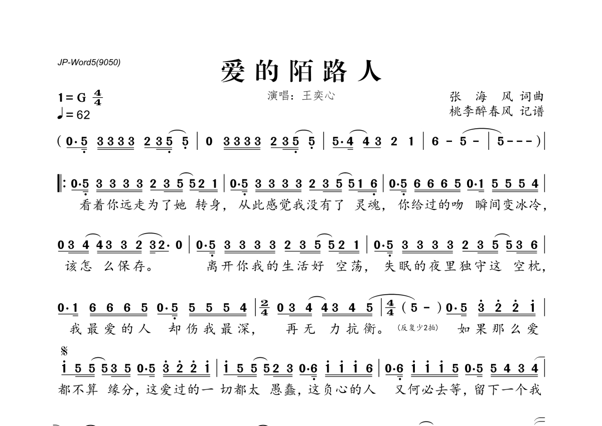 王奕心《爱的陌路人》简谱