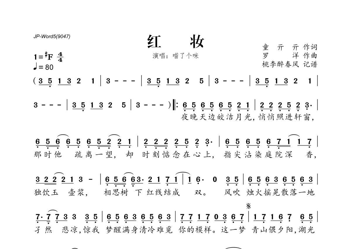 《红妆》是喵了个咪演唱的一首歌曲,拍号为4/4拍,歌曲速度为每分钟80拍,这份简谱共有一张高清图谱,图谱由 @桃李醉春风 编配上传。