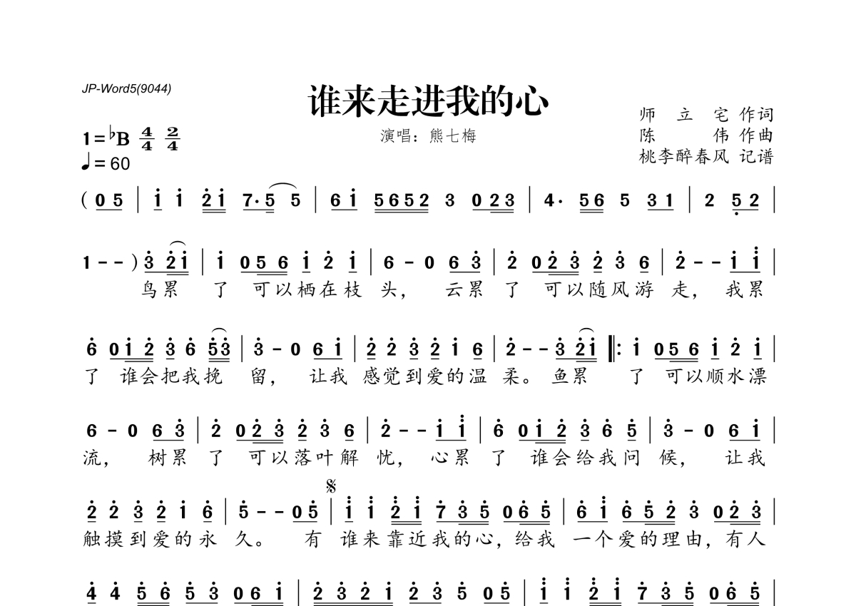 《谁来走进我的心》是熊七梅演唱的一首歌曲,拍号为4/4拍,歌曲速度为每分钟60拍,这份简谱共有一张高清图谱,图谱由 @桃李醉春风 编配上传。