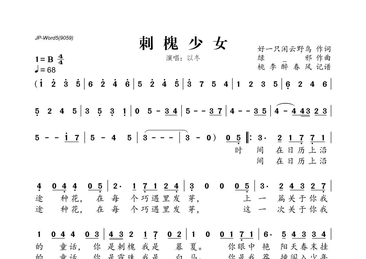 《刺槐少女》是以冬演唱的一首歌曲,拍号为4/4拍,歌曲速度为每分钟68拍,这份简谱共有一张高清图谱,图谱由 @桃李醉春风 编配上传。