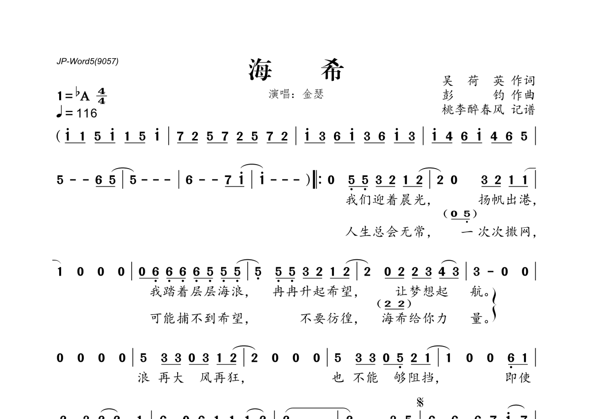 《海希》是金瑟演唱的一首歌曲,拍号为4/4拍,歌曲速度为每分钟116拍,这份简谱共有一张高清图谱,图谱由 @桃李醉春风 编配上传。