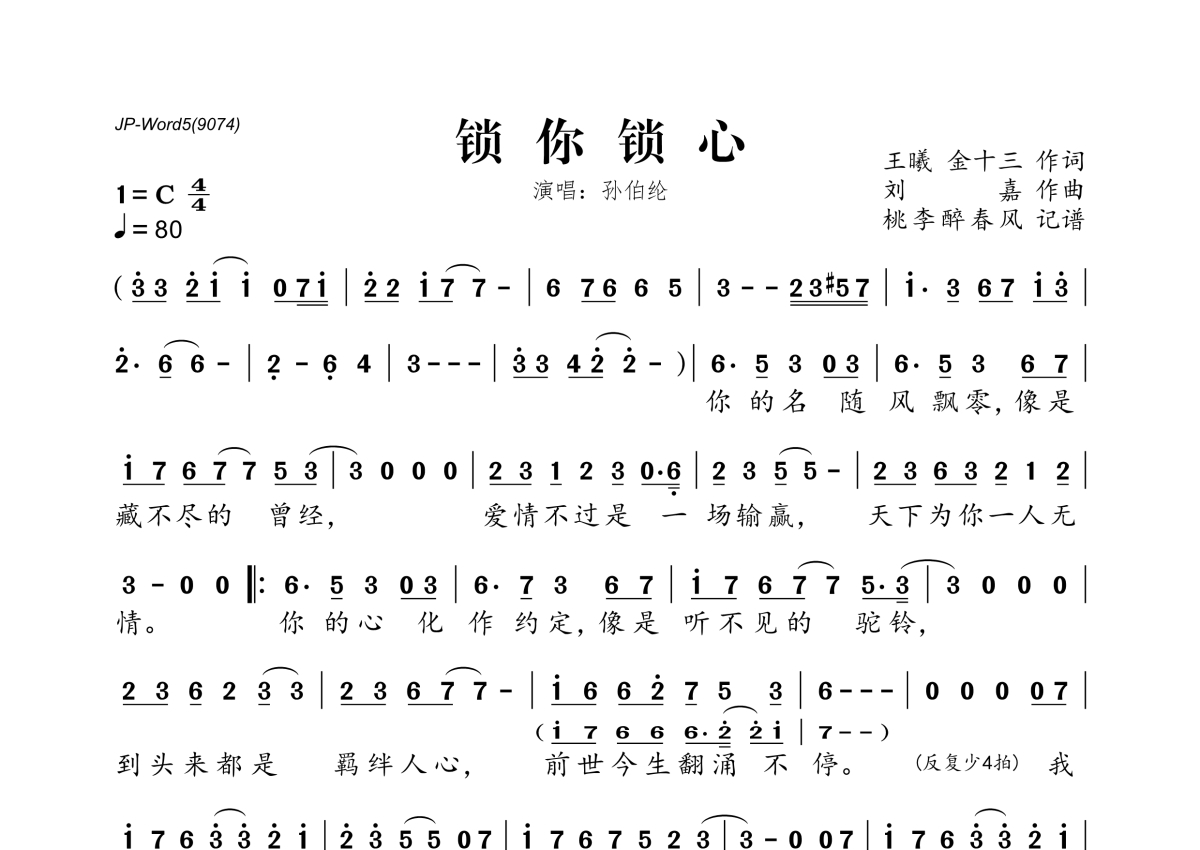 《锁你锁心》是孙伯纶演唱的一首歌曲,拍号为4/4拍,歌曲速度为每分钟80拍,这份简谱共有一张高清图谱,图谱由 @桃李醉春风 编配上传。