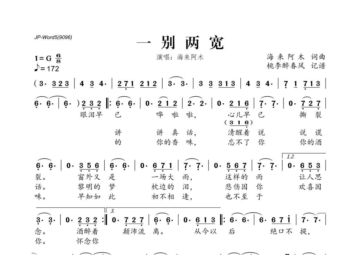 一别两宽简谱 - 海来阿木演唱