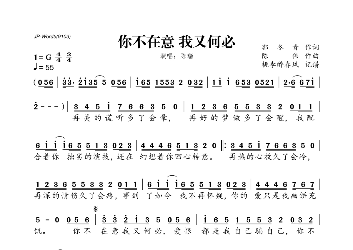 《你不在意 我又何必》是陈瑞演唱的一首歌曲,拍号为4/4拍,歌曲速度为每分钟55拍,这份简谱共有一张高清图谱,图谱由 @桃李醉春风 编配上传。