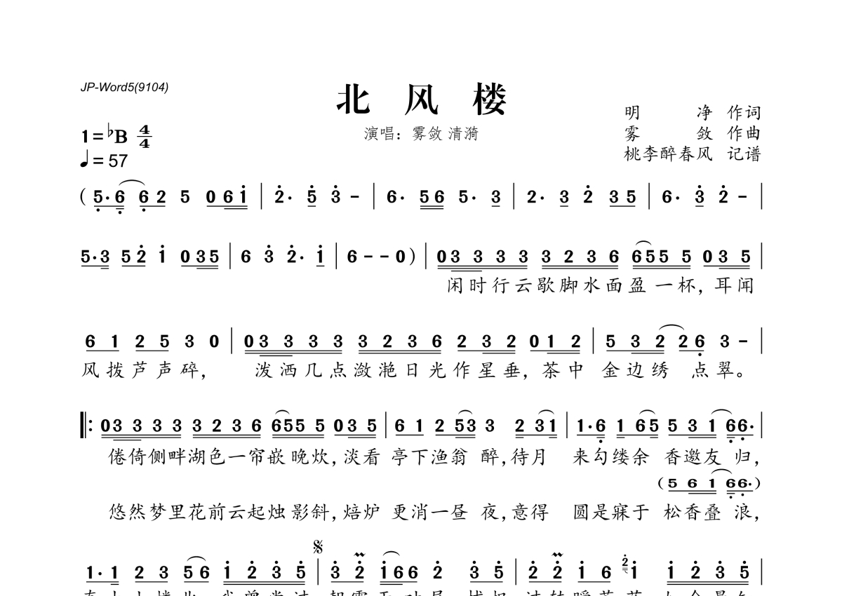 《北风楼》是雾敛&清漪演唱的一首歌曲,拍号为4/4拍,歌曲速度为每分钟57拍,这份简谱共有一张高清图谱,图谱由 @桃李醉春风 编配上传。