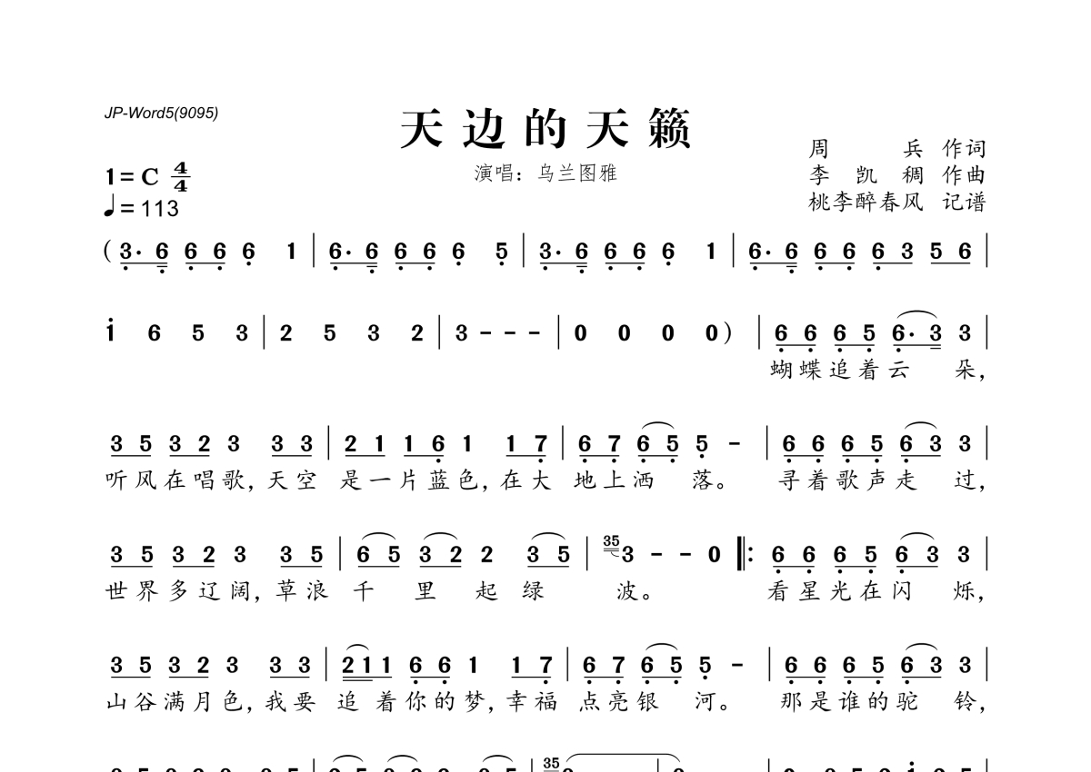 《天边的天籁》是鸟兰图雅演唱的一首歌曲,拍号为4/4拍,歌曲速度为每分钟113拍,这份简谱共有一张高清图谱,图谱由 @桃李醉春风 编配上传。