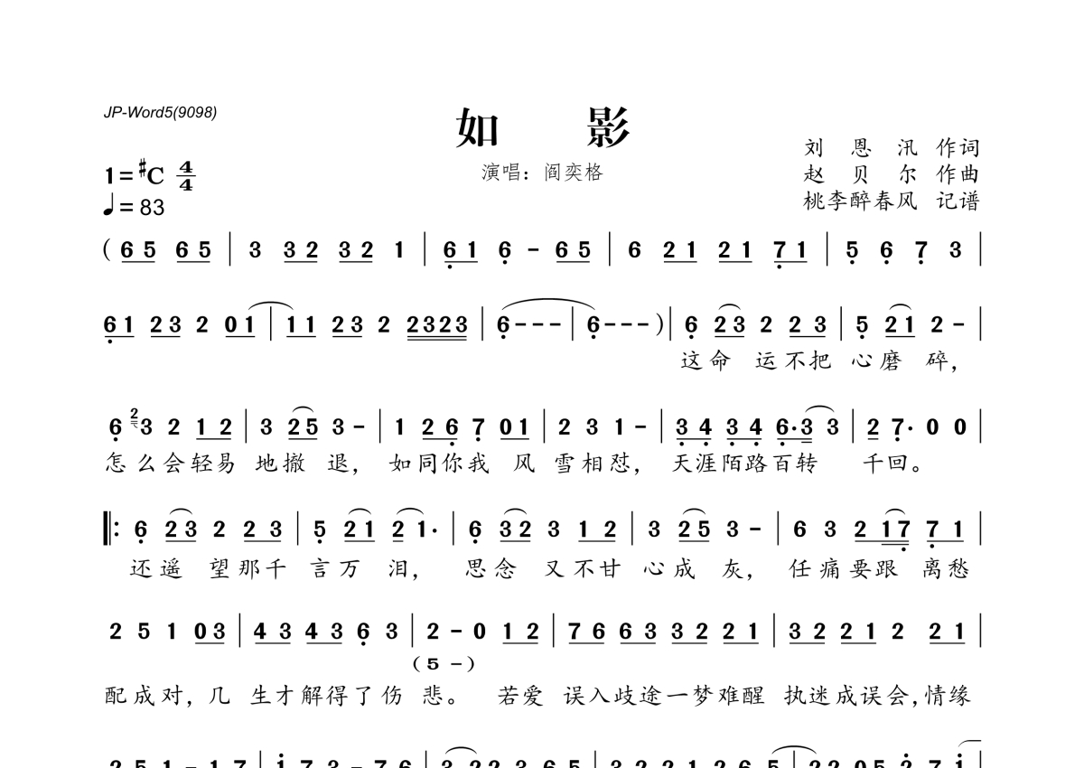 《如影》是阎奕格演唱的一首歌曲,拍号为4/4拍,歌曲速度为每分钟83拍,这份简谱共有一张高清图谱,图谱由 @桃李醉春风 编配上传。