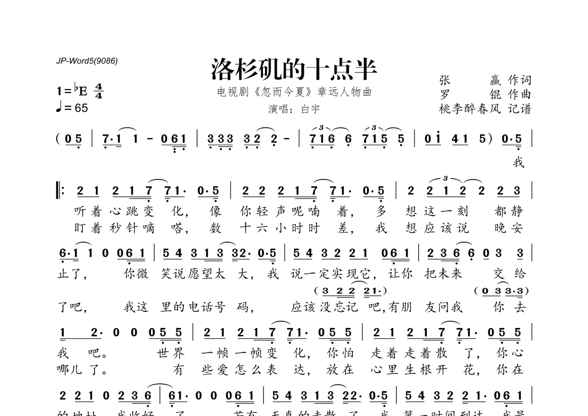 《洛杉矶的十点半》是白宇演唱的一首歌曲,拍号为4/4拍,歌曲速度为每分钟65拍,这份简谱共有一张高清图谱,图谱由 @桃李醉春风 编配上传。