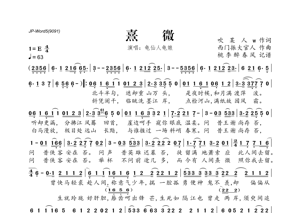 《熹微》是龟仙人龟娘演唱的一首歌曲,拍号为4/4拍,歌曲速度为每分钟63拍,这份简谱共有一张高清图谱,图谱由 @桃李醉春风 编配上传。