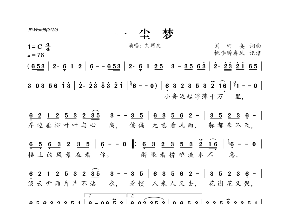 《一尘梦》是刘珂矣演唱的一首歌曲,拍号为4/4拍,歌曲速度为每分钟76拍,这份简谱共有一张高清图谱,图谱由 @桃李醉春风 编配上传。