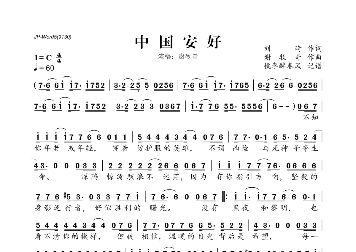 谢牧奇《中国安好》简谱