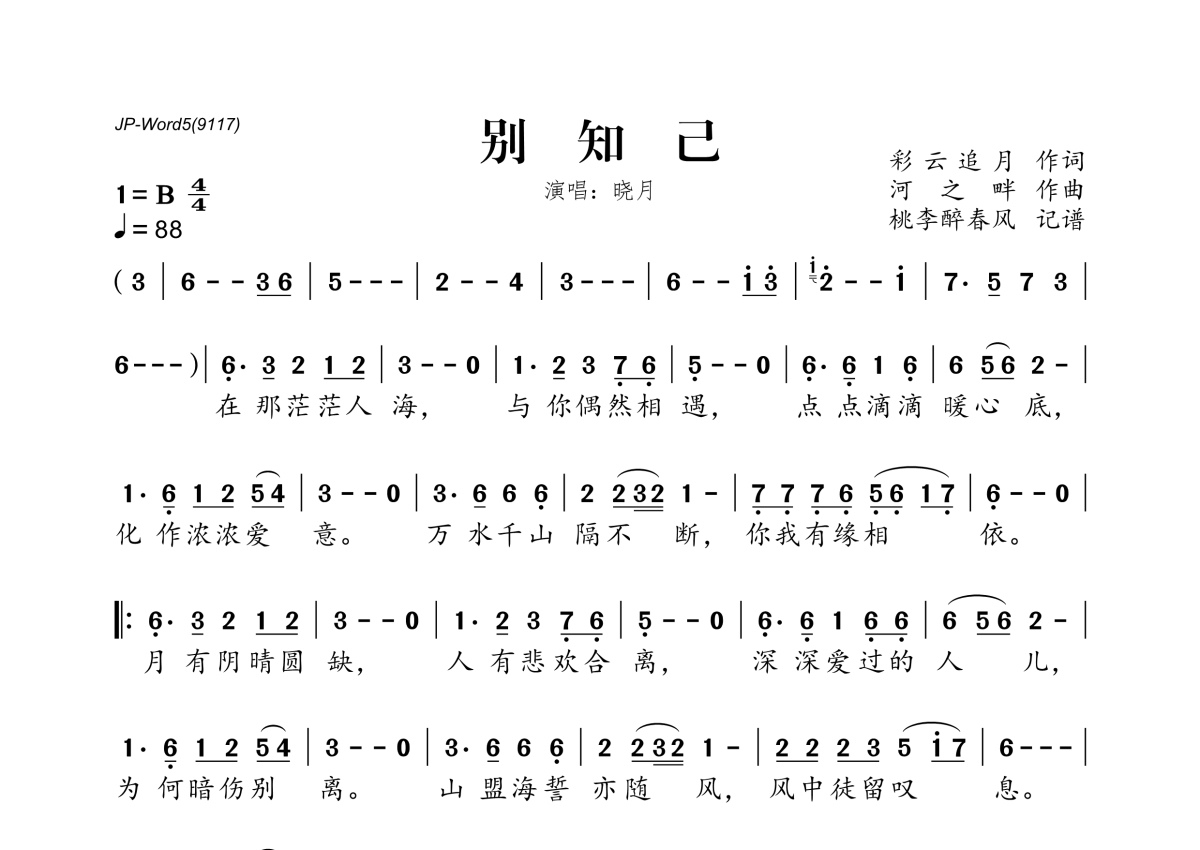 晓月《别知己》简谱