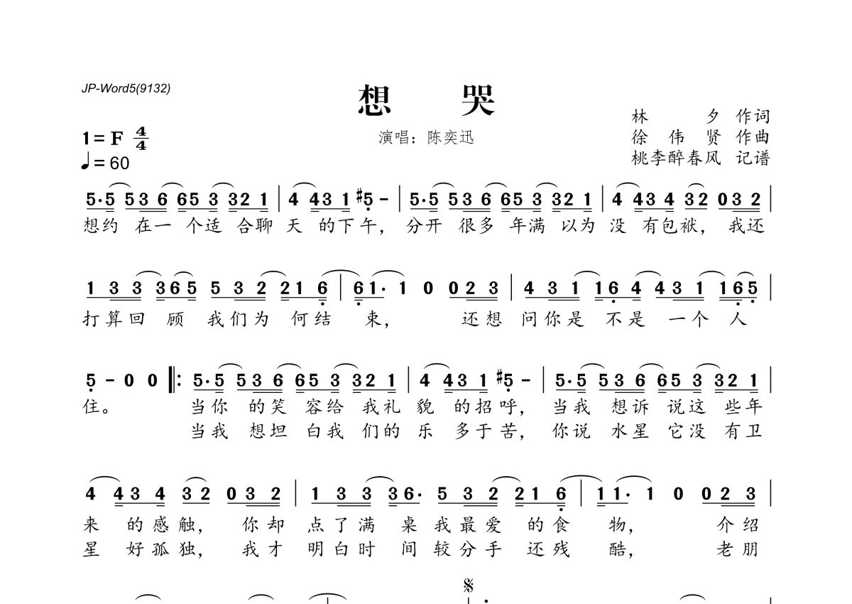 《想哭》是陈奕迅演唱的一首歌曲,拍号为4/4拍,歌曲速度为每分钟60拍,这份简谱共有一张高清图谱,图谱由 @桃李醉春风 编配上传。