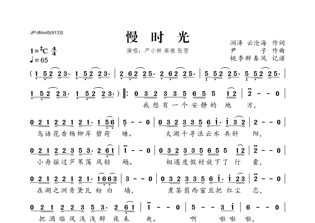 《慢时光》是严小妍&高雅&张雪演唱的一首歌曲,拍号为4/4拍,歌曲速度为每分钟65拍,这份简谱共有一张高清图谱,图谱由 @桃李醉春风 编配上传。