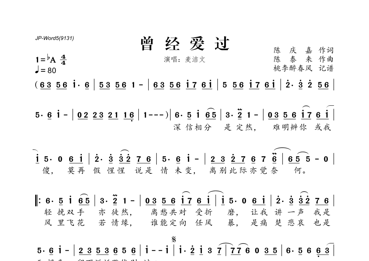 《曾经爱过》是麦洁文演唱的一首歌曲,拍号为4/4拍,歌曲速度为每分钟80拍,这份简谱共有一张高清图谱,图谱由 @桃李醉春风 编配上传。