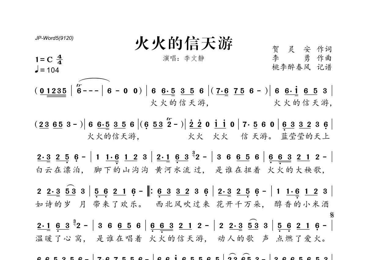 《火火的信天游》是李文静演唱的一首歌曲,拍号为4/4拍,歌曲速度为每分钟104拍,这份简谱共有一张高清图谱,图谱由 @桃李醉春风 编配上传。