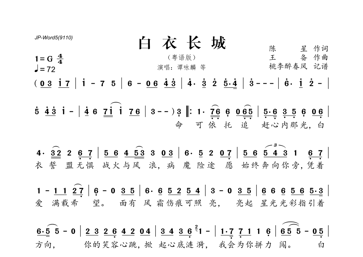 谭咏麟《白衣长城》简谱 - 粤语版