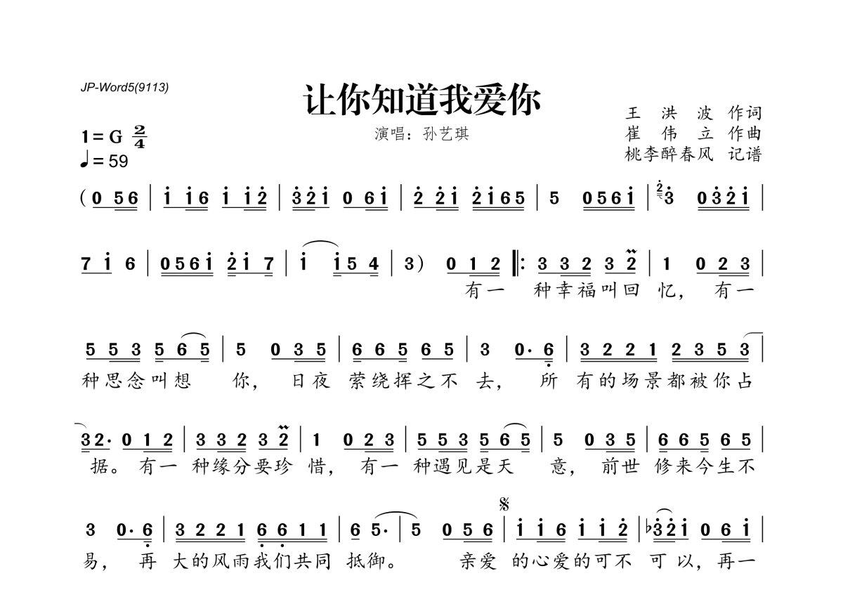 《让你知道我爱你》是孙艺琪演唱的一首歌曲,拍号为2/4拍,歌曲速度为每分钟59拍,这份简谱共有一张高清图谱,图谱由 @桃李醉春风 编配上传。
