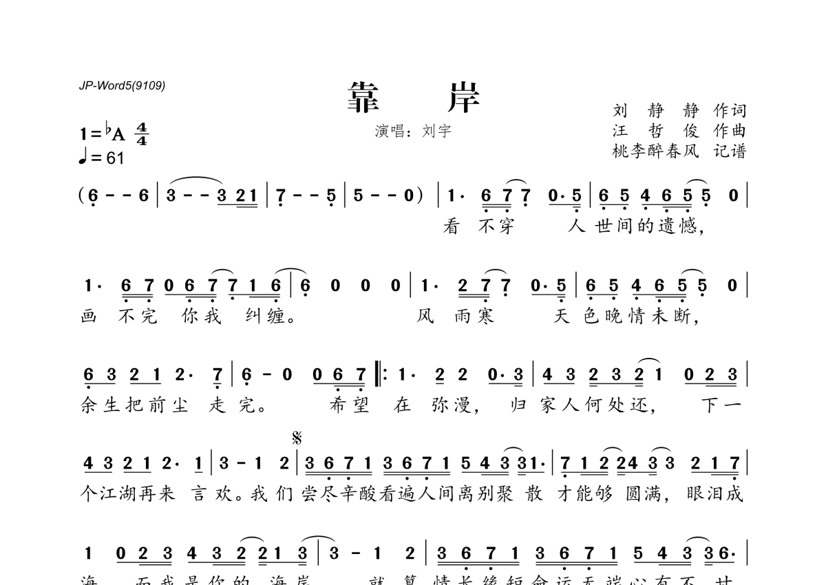 《靠岸》是刘宇演唱的一首歌曲,拍号为4/4拍,歌曲速度为每分钟61拍,这份简谱共有一张高清图谱,图谱由 @桃李醉春风 编配上传。
