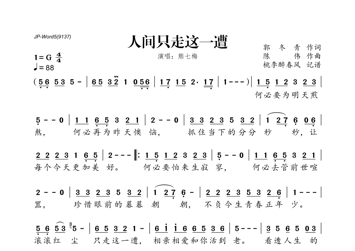 《人间只走这一遭》是熊七梅演唱的一首歌曲,拍号为4/4拍,歌曲速度为每分钟88拍,这份简谱共有一张高清图谱,图谱由 @桃李醉春风 编配上传。