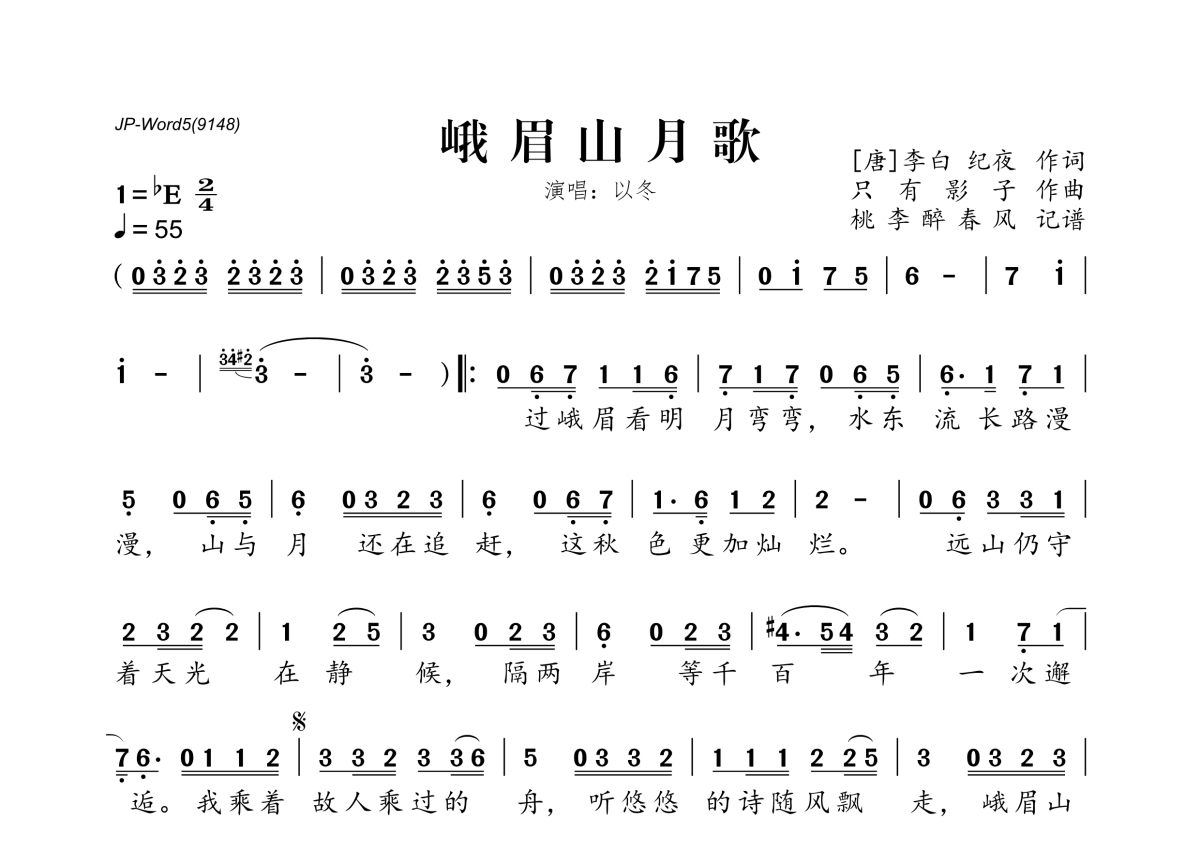 《峨眉山月歌》是以冬演唱的一首歌曲,拍号为2/4拍,歌曲速度为每分钟55拍,这份简谱共有一张高清图谱,图谱由 @桃李醉春风 编配上传。