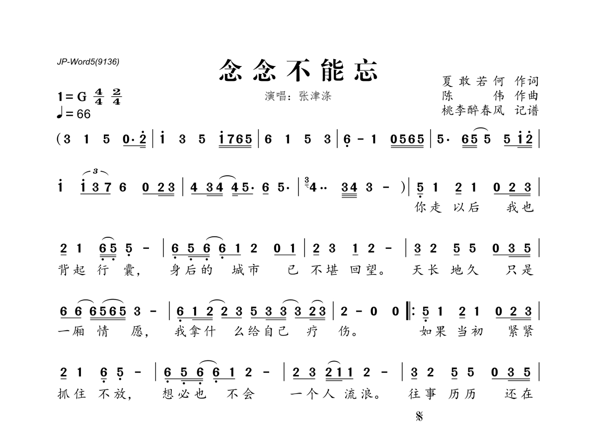 《念念不能忘》是张津涤演唱的一首歌曲,拍号为4/4拍,歌曲速度为每分钟66拍,这份简谱共有一张高清图谱,图谱由 @桃李醉春风 编配上传。