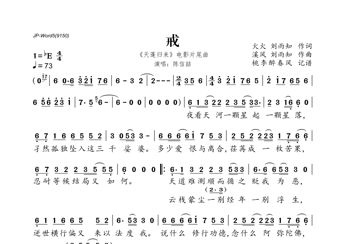 《戒》是陈信喆演唱的一首歌曲,拍号为4/4拍,歌曲速度为每分钟73拍,这份简谱共有一张高清图谱,图谱由 @桃李醉春风 编配上传。
