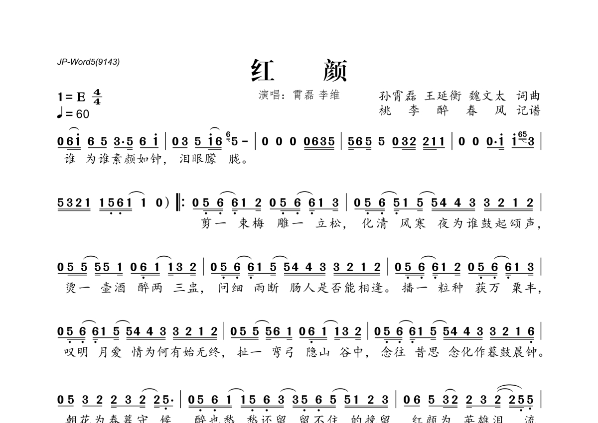《红颜》是霄磊&李维演唱的一首歌曲,拍号为4/4拍,歌曲速度为每分钟60拍,这份简谱共有一张高清图谱,图谱由 @桃李醉春风 编配上传。