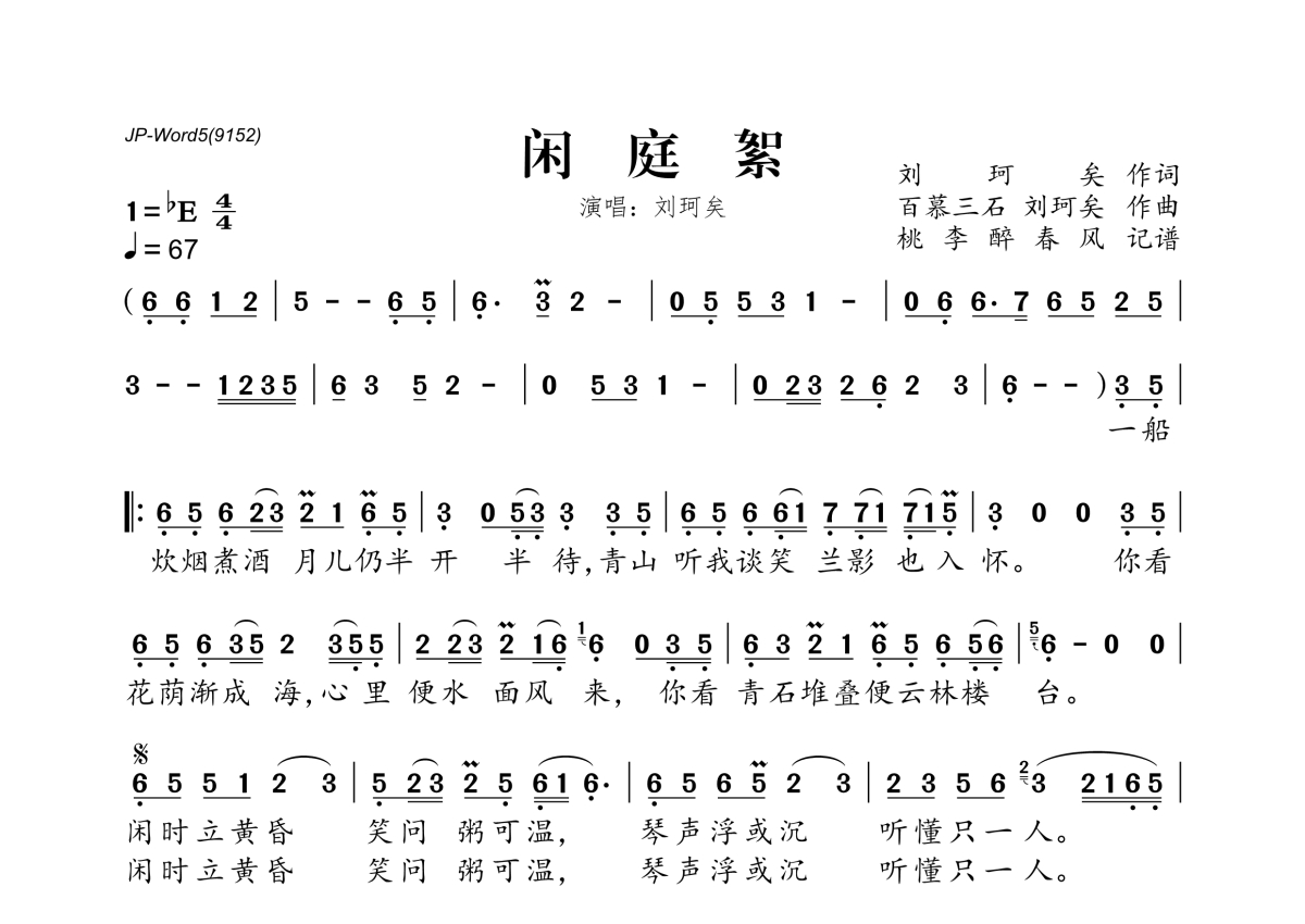 《闲庭絮》是刘珂矣演唱的一首歌曲,拍号为4/4拍,歌曲速度为每分钟67拍,这份简谱共有一张高清图谱,图谱由 @桃李醉春风 编配上传。