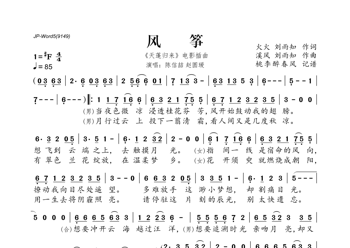 《风筝》是陈信喆&赵圆瑗演唱的一首歌曲,拍号为4/4拍,歌曲速度为每分钟85拍,这份简谱共有一张高清图谱,图谱由 @桃李醉春风 编配上传。