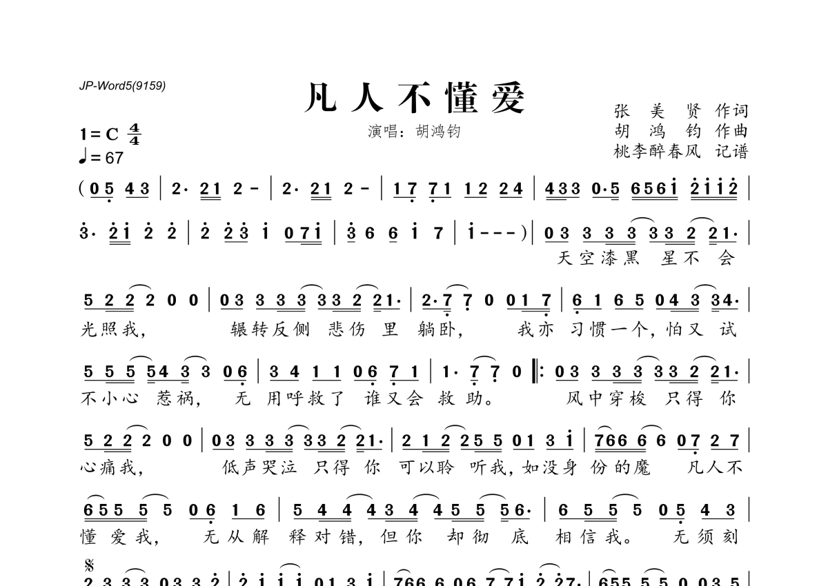 《凡人不懂爱》是胡鸿钧演唱的一首歌曲,拍号为4/4拍,歌曲速度为每分钟67拍,这份简谱共有一张高清图谱,图谱由 @桃李醉春风 编配上传。