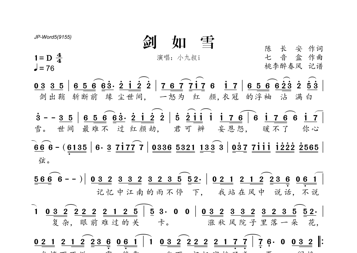 《剑如雪》是小九叔i演唱的一首歌曲,拍号为4/4拍,歌曲速度为每分钟76拍,这份简谱共有一张高清图谱,图谱由 @桃李醉春风 编配上传。