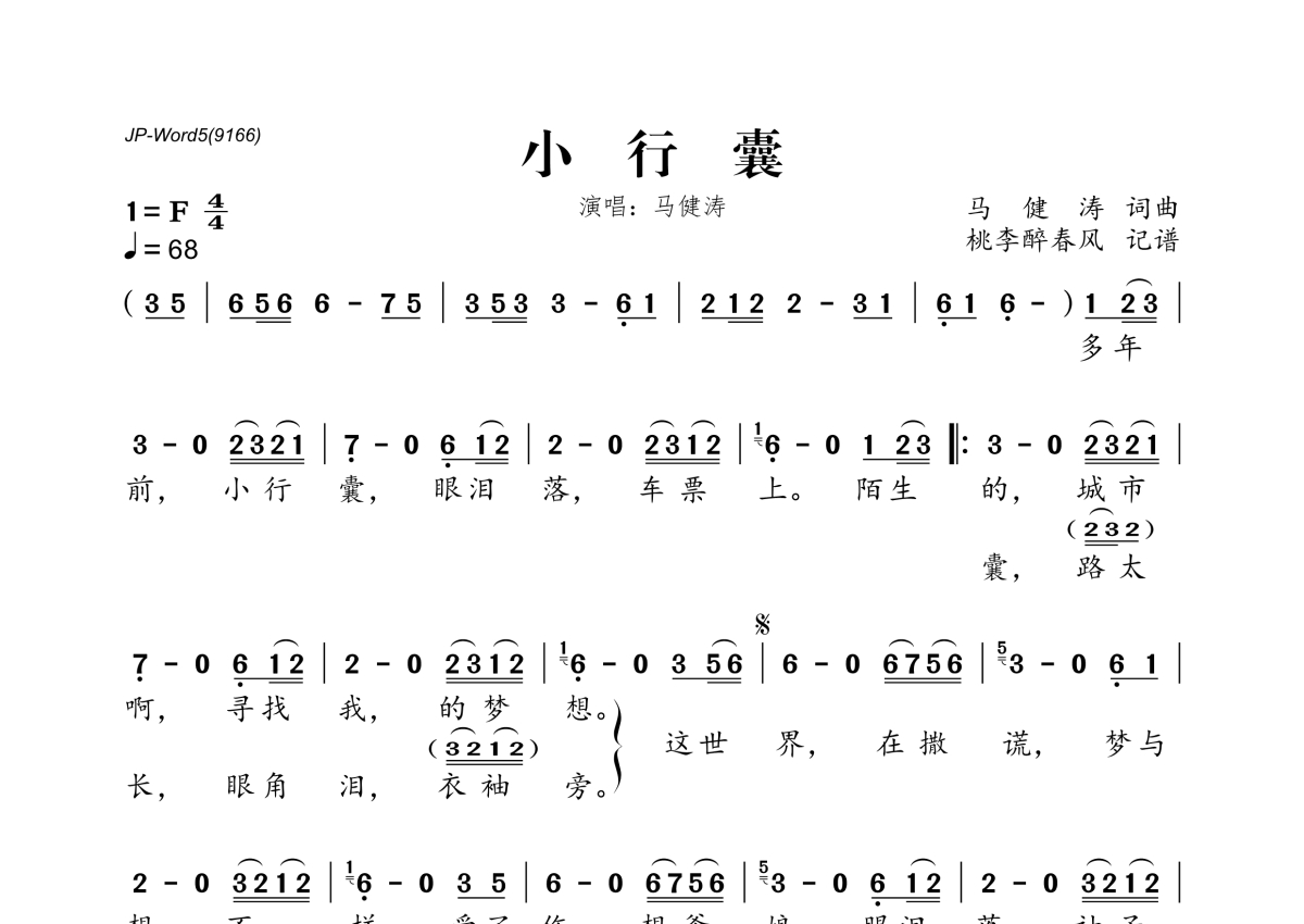 小行囊简谱 - 马健涛演唱