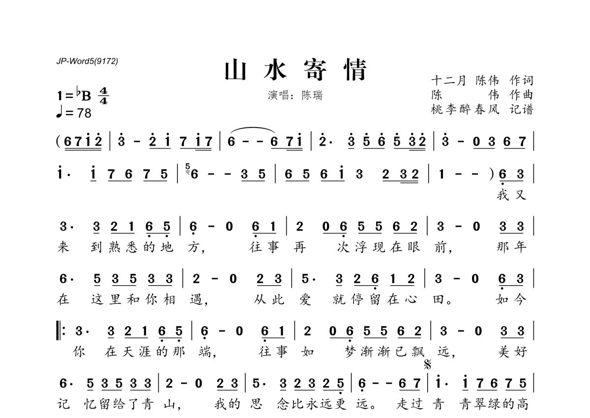 《山水寄情》是陈瑞演唱的一首歌曲,拍号为4/4拍,歌曲速度为每分钟78拍,这份简谱共有一张高清图谱,图谱由 @桃李醉春风 编配上传。
