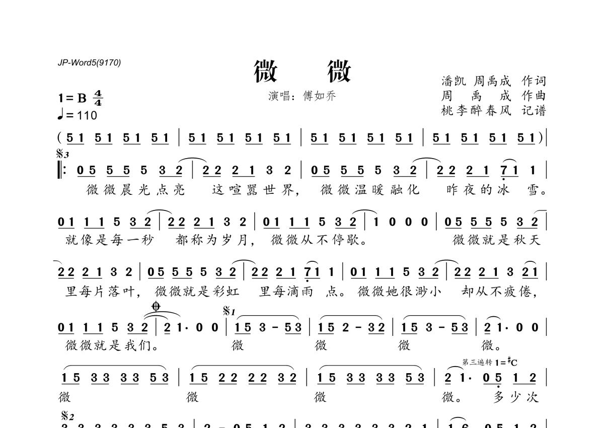 《微微》是傅如乔演唱的一首歌曲,拍号为4/4拍,歌曲速度为每分钟110拍,这份简谱共有一张高清图谱,图谱由 @桃李醉春风 编配上传。