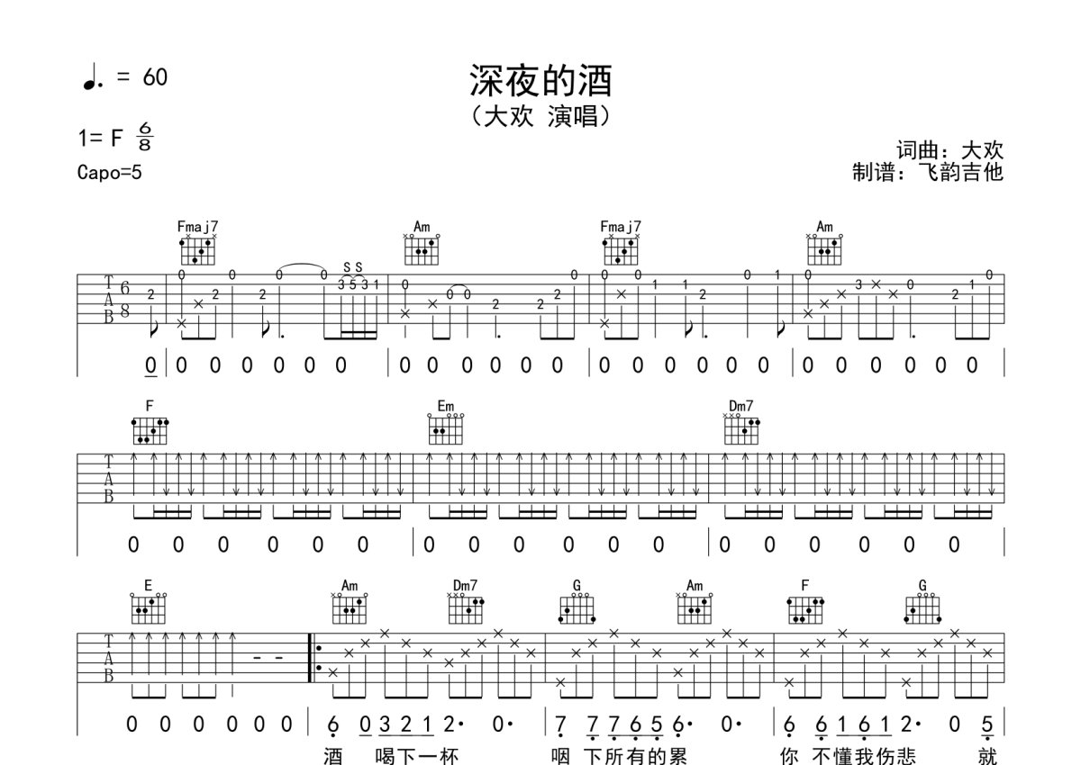 大欢《深夜的酒》吉他谱 - C调弹唱六线谱