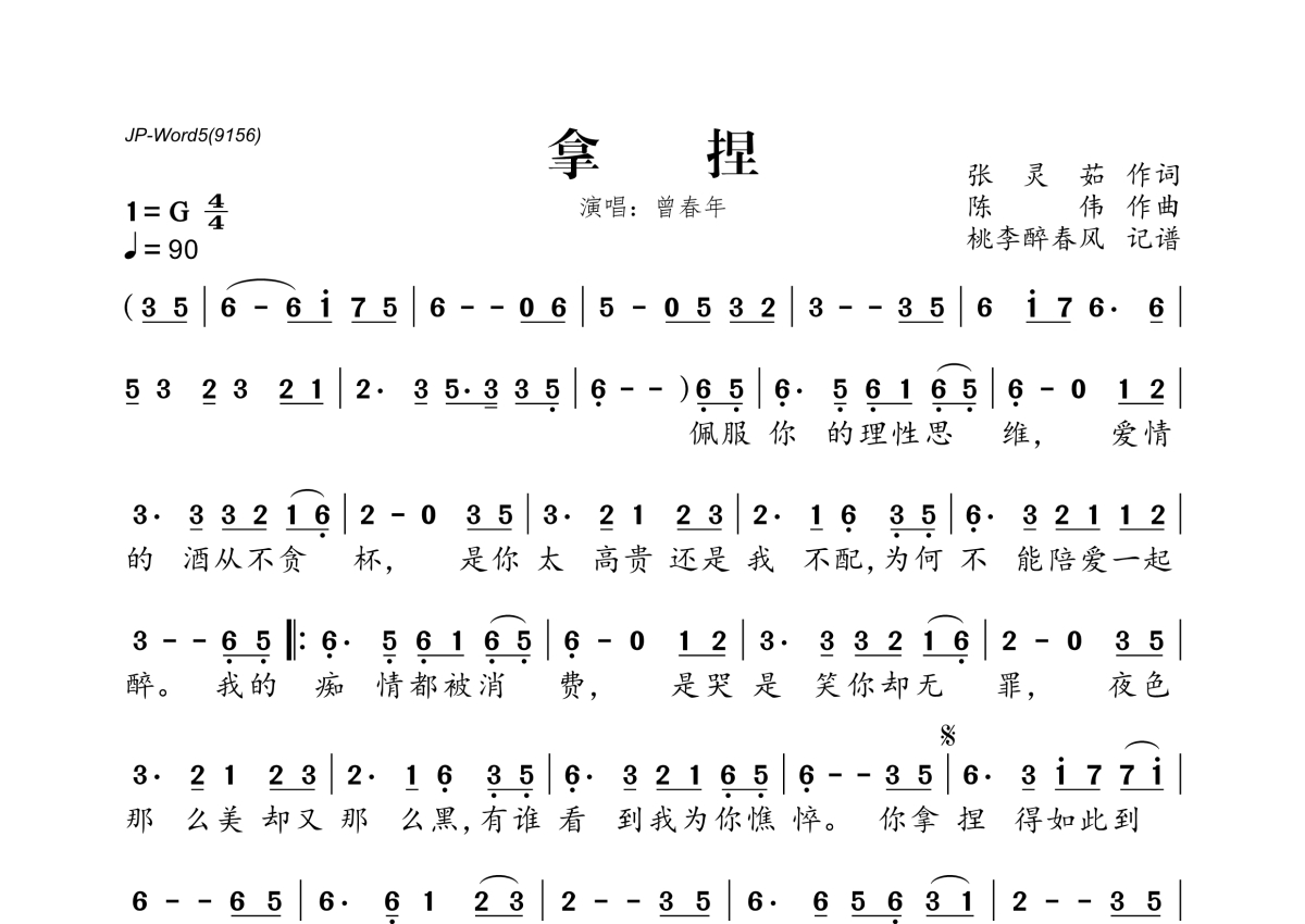 《拿捏》是曾春年演唱的一首歌曲,拍号为4/4拍,歌曲速度为每分钟90拍,这份简谱共有一张高清图谱,图谱由 @桃李醉春风 编配上传。