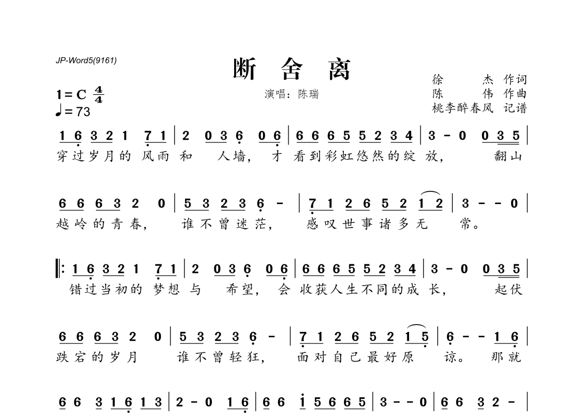 《断舍离》是陈瑞演唱的一首歌曲,拍号为4/4拍,歌曲速度为每分钟73拍,这份简谱共有一张高清图谱,图谱由 @桃李醉春风 编配上传。