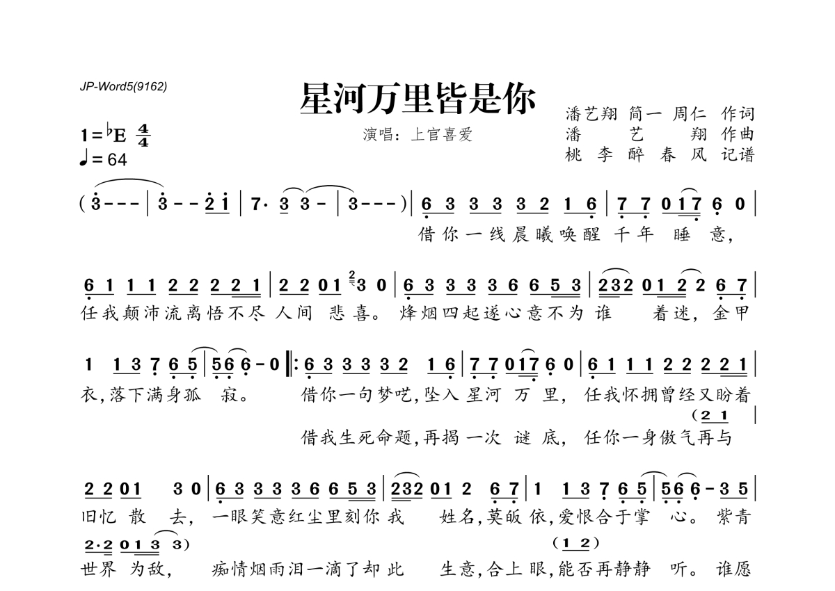 《星河万里皆是你》是上官喜爱演唱的一首歌曲,拍号为4/4拍,歌曲速度为每分钟64拍,这份简谱共有一张高清图谱,图谱由 @桃李醉春风 编配上传。