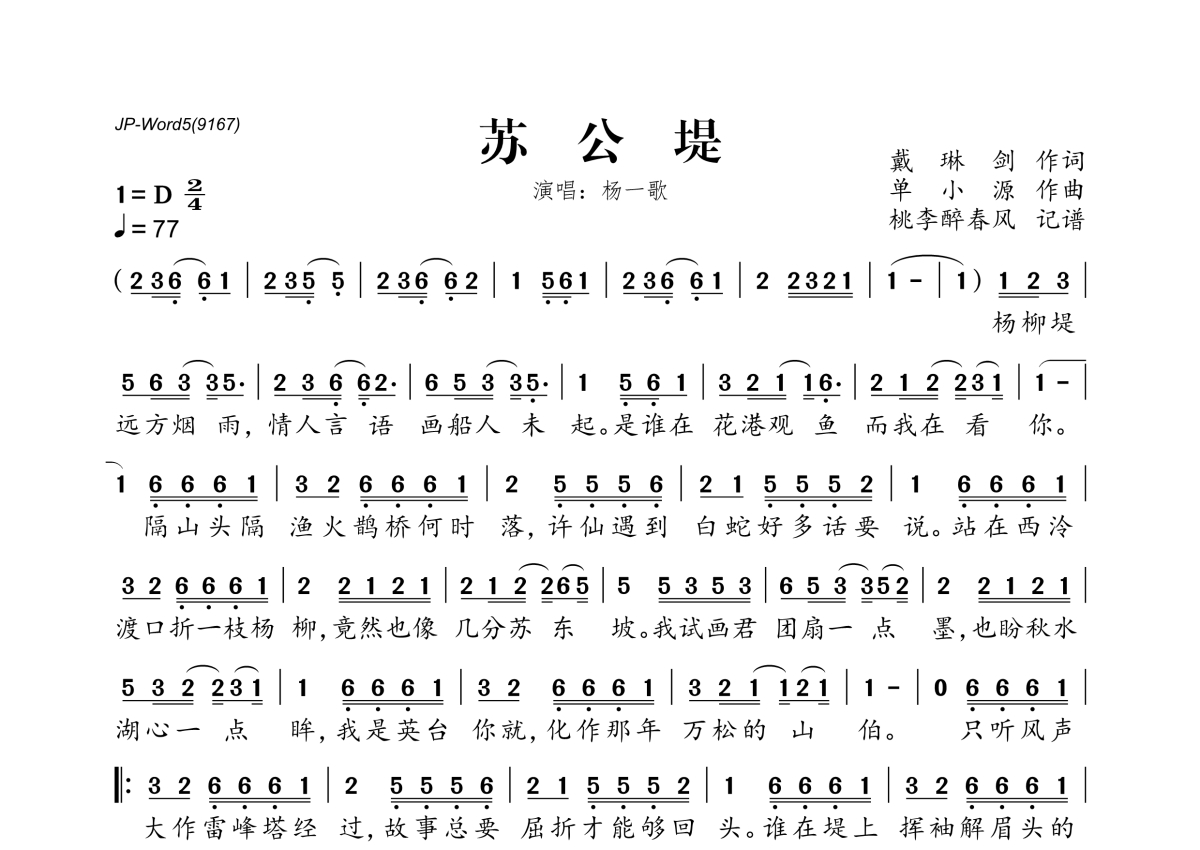 《苏公堤》是杨一歌演唱的一首歌曲,拍号为2/4拍,歌曲速度为每分钟77拍,这份简谱共有一张高清图谱,图谱由 @桃李醉春风 编配上传。