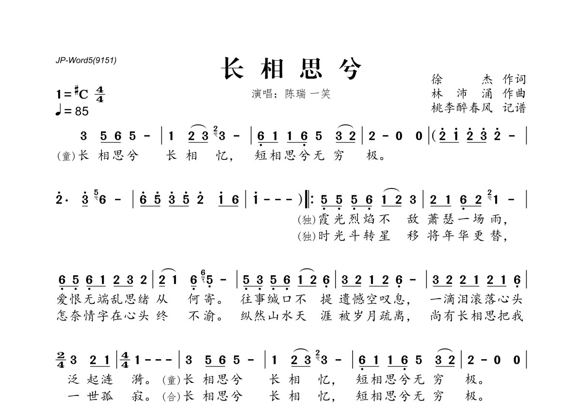 《长相思兮》是陈瑞一笑演唱的一首歌曲,拍号为4/4拍,歌曲速度为每分钟85拍,这份简谱共有一张高清图谱,图谱由 @桃李醉春风 编配上传。