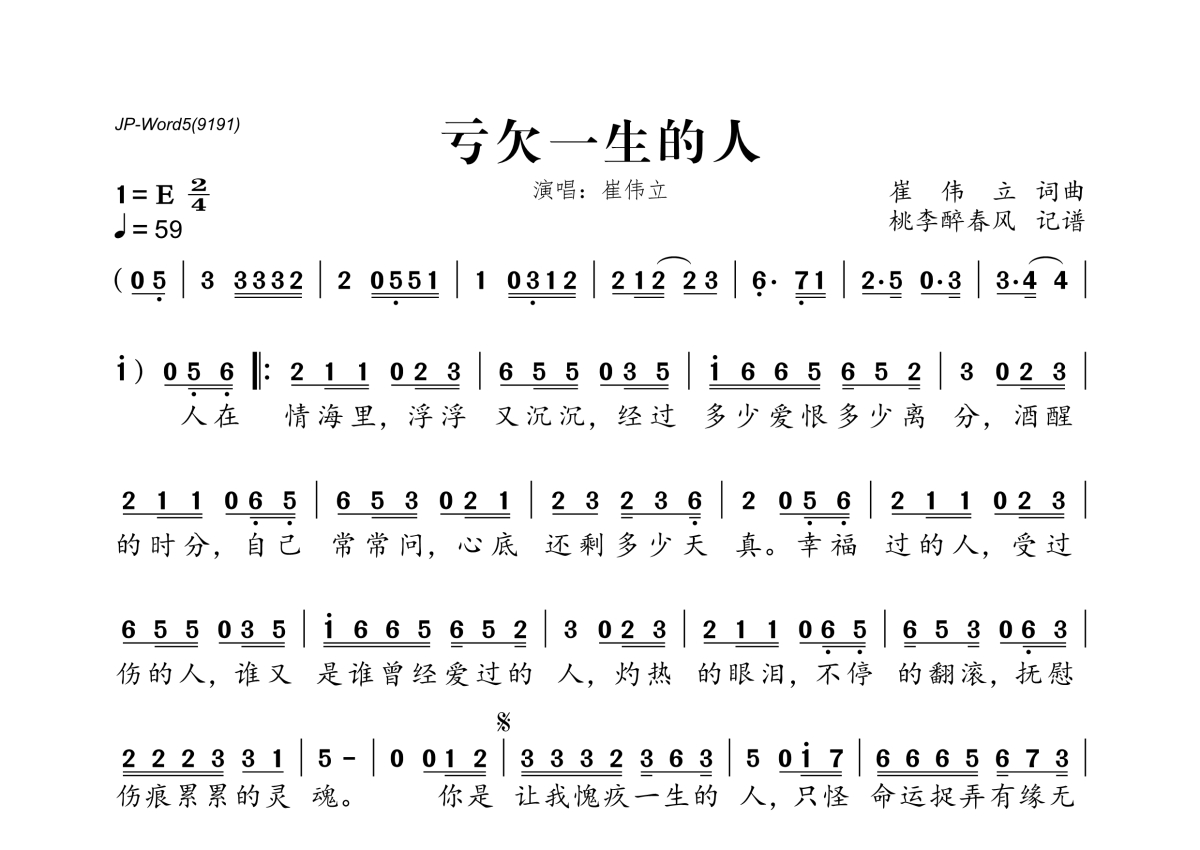 《亏欠一生的人》是崔伟立演唱的一首歌曲,拍号为2/4拍,歌曲速度为每分钟59拍,这份简谱共有一张高清图谱,图谱由 @桃李醉春风 编配上传。
