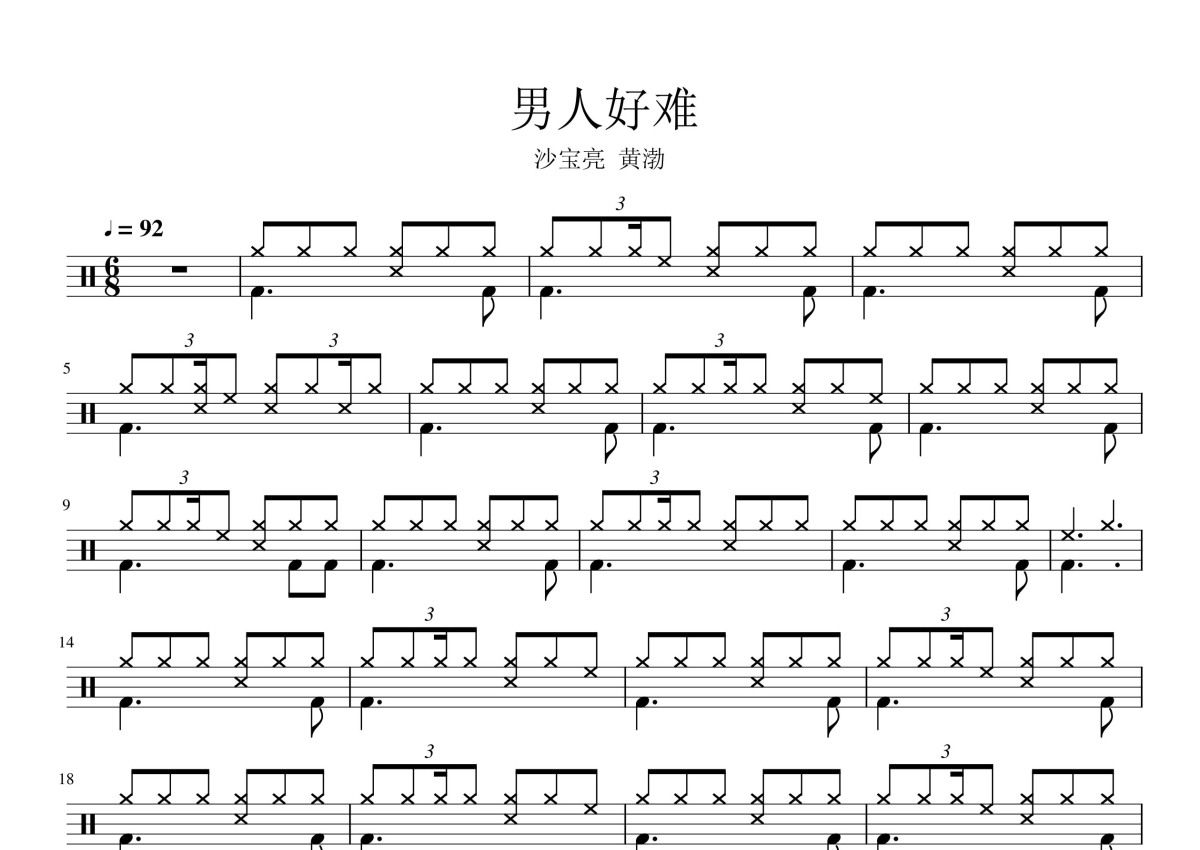 《男人好难》是沙宝亮/黄渤演唱的一首歌曲,这份鼓谱共有四张高清图谱,图谱由 @打鼓谱 编配上传,图谱使用五线谱编配,使用这份男人好难架子鼓谱,你将能够轻松地敲打出这首沙宝亮/黄渤的男人好难,快来尝试吧。《男人好难》沙宝亮和黄渤合唱歌曲。黄渤,1974年8月26日出生于山东省青岛市,祖籍甘肃省定西市临洮县,中国内地男演员、导演、歌手,中国电影家协会副主席。