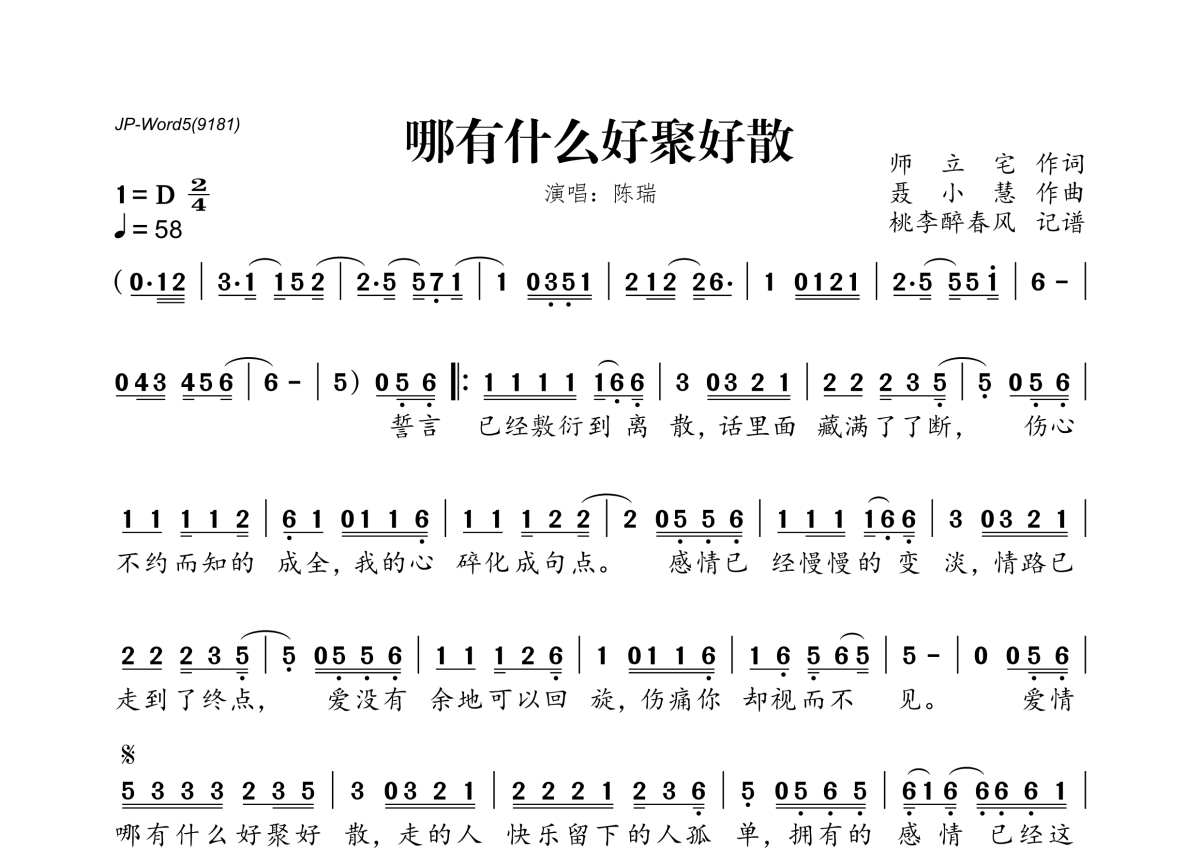 《哪有什么好聚好散》是陈瑞演唱的一首歌曲,拍号为2/4拍,歌曲速度为每分钟58拍,这份简谱共有一张高清图谱,图谱由 @桃李醉春风 编配上传。