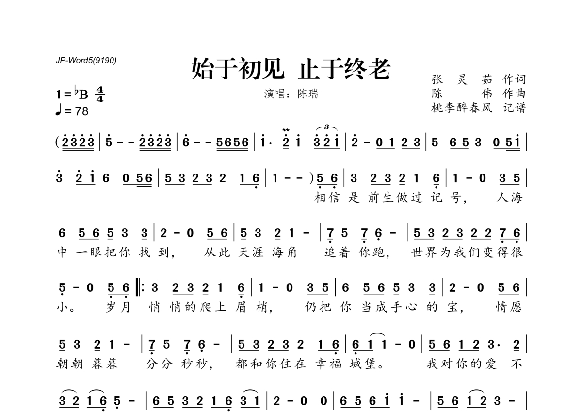 《始于初见 止于终老》是陈瑞演唱的一首歌曲,拍号为4/4拍,歌曲速度为每分钟78拍,这份简谱共有一张高清图谱,图谱由 @桃李醉春风 编配上传。