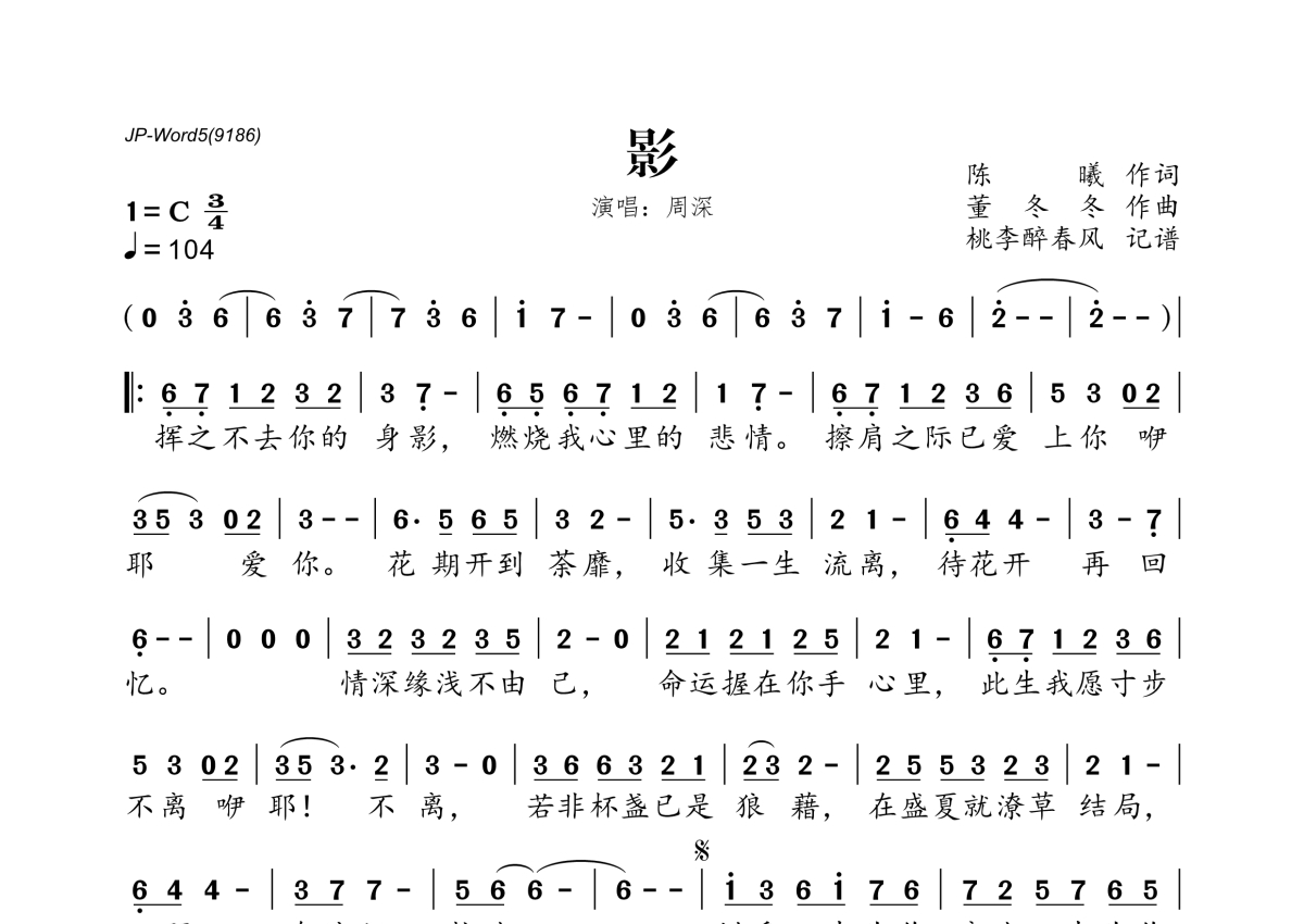 《影》是周深演唱的一首歌曲,拍号为3/4拍,歌曲速度为每分钟104拍,这份简谱共有一张高清图谱,图谱由 @桃李醉春风 编配上传。