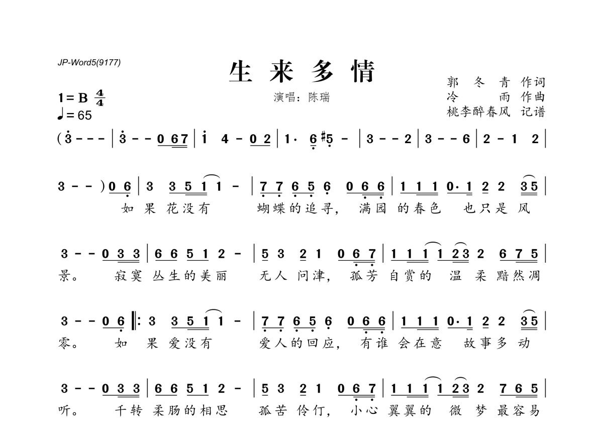 《生来多情》是陈瑞演唱的一首歌曲,拍号为4/4拍,歌曲速度为每分钟65拍,这份简谱共有一张高清图谱,图谱由 @桃李醉春风 编配上传。