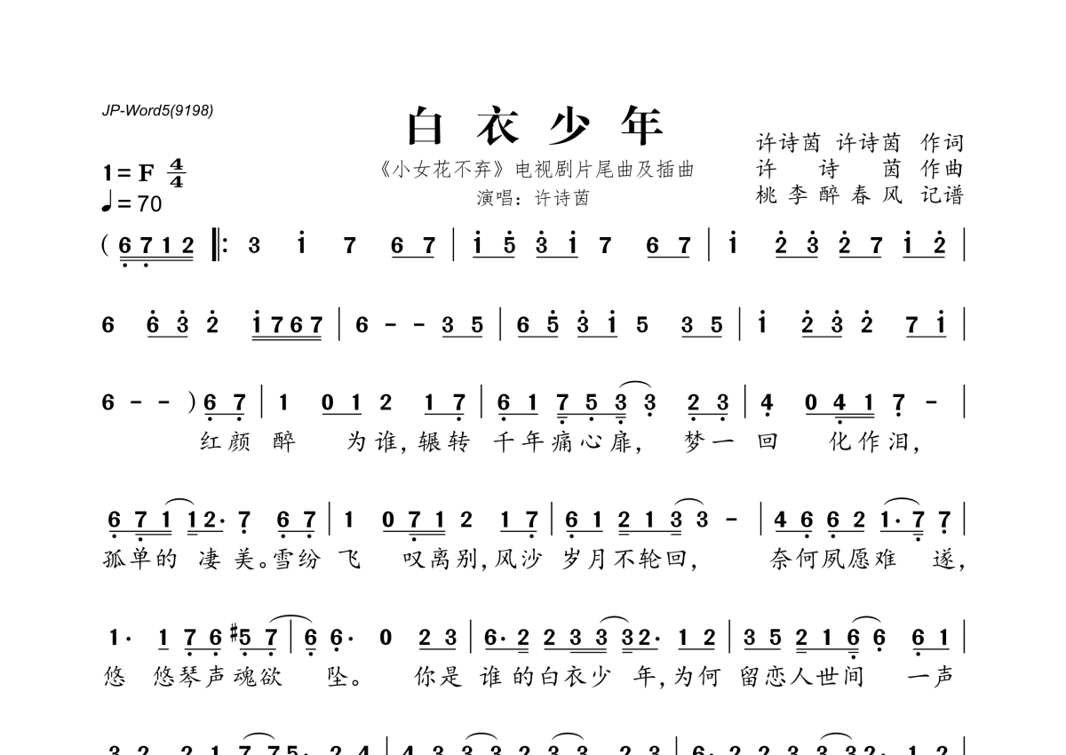 《白衣少年》是许诗茵演唱的一首歌曲,拍号为4/4拍,歌曲速度为每分钟70拍,这份简谱共有一张高清图谱,图谱由 @桃李醉春风 编配上传。