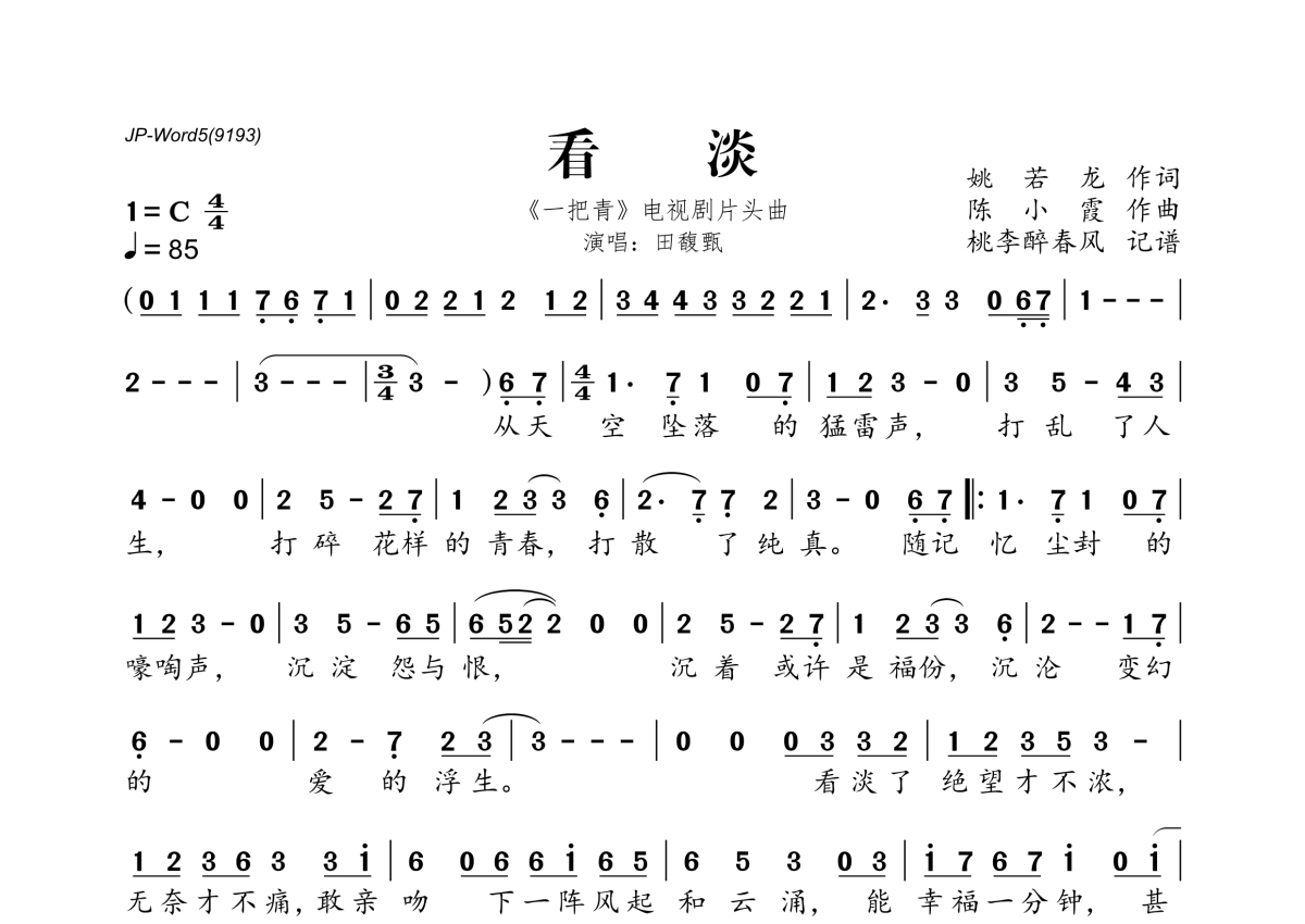 《看淡》是田馥甄演唱的一首歌曲,拍号为4/4拍,歌曲速度为每分钟85拍,这份简谱共有一张高清图谱,图谱由 @桃李醉春风 编配上传。