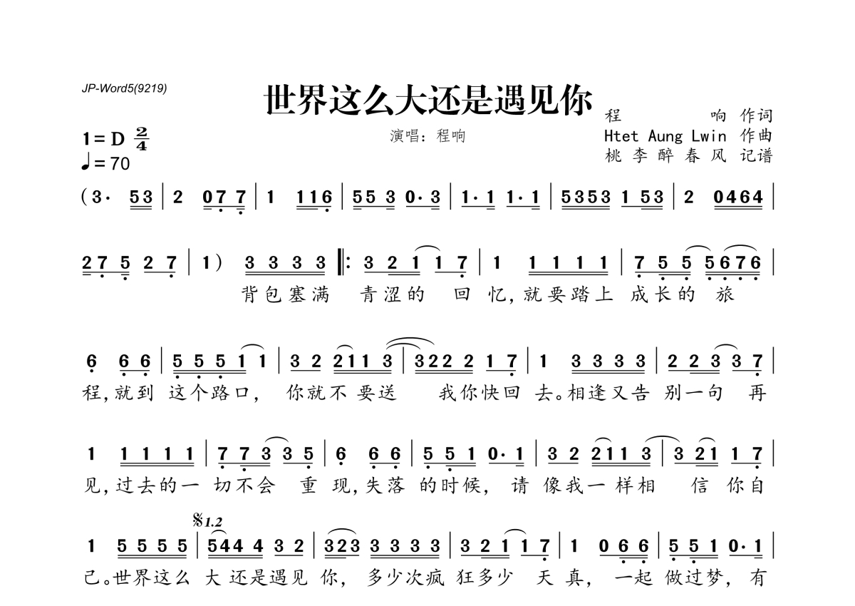 《世界这么大还是遇见你》是程响演唱的一首歌曲,拍号为2/4拍,歌曲速度为每分钟70拍,这份简谱共有一张高清图谱,图谱由 @桃李醉春风 编配上传。